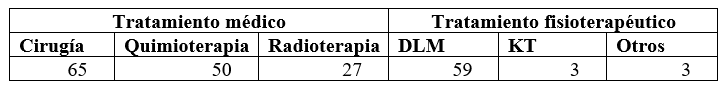La mayoría de las pacientes incluidas en el estudio fueron intervenidas quirúrgicamente (65); 59 de las cuales recibieron tratamiento de drenaje linfático manual. La colocación de drenajes alrededor de la mama luego de la cirugía facilita el drenaje del exceso de fluidos acumulados; lo que reduce el riesgo de infección y aparición de linfedema, además del dolor. El tratamiento fisioterapéutico pertinente resulta una manera mecánica de apoyar al mejor drenaje linfático para evitar la formación de linfedema a largo plazo, según indica Tzani et al. (13)
