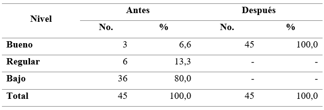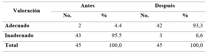 Previo a la aplicación del programa educativo, la ejecución técnica del lavado de manos se valoró como adecuada solo en un 4,4% de los estudiantes involucrados. Luego de la implementación, esa cifra se elevó hasta el 93.3% (tabla 2). En esta variable también se obtuvieron cambios estadísticamente significativos con valor p<0,05.