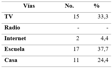 Al analizar las vías por las que obtuvieron información sobre la higiene de manos, resaltan la televisión (33,3%) entre los medios de difusión masiva, además de los entornos escolar (37,7%) y familiar (24.4%) como potenciadores de estos hábitos higiénicos (tabla 4).