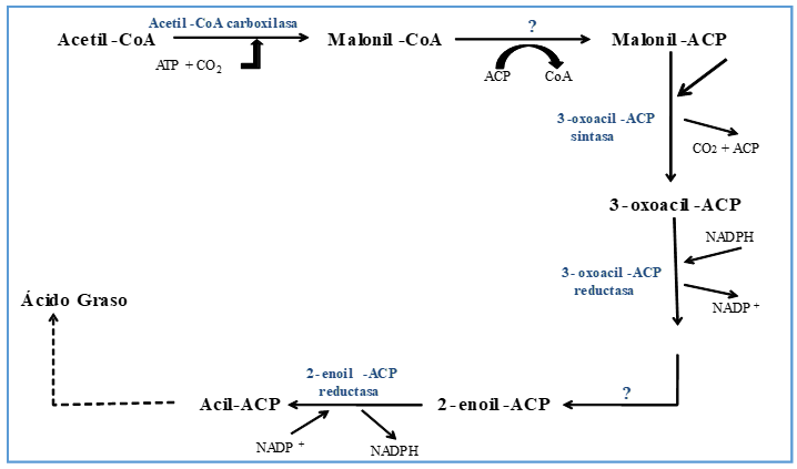 Una de las diferencias cruciales entre el metabolismo de los ácidos grasos de mamíferos y el de Blastocystis es su ubicación subcelular diferente: en humanos y hongos ocurre en el citosol (anabolismo de ácidos grasos), en plantas ocurre en cloroplastos; mientras que, en el cromista, se produce en las MLOs. El principal precursor de la biosíntesis de ácidos grasos es el malonil-CoA (figura 1), derivado a su vez del Acetil-CoA. En este paso donde se produce la regulación de la vía anabólica, la enzima limitante de la tasa metabólica es la acetil-CoA carboxilasa, responsable de la transferencia de un átomo de carbono derivado del CO. hasta el sustrato, que requiere del cofactor biotina.(48) Esta enzima fue predicha para Blastocystis; sin embargo, hay otras enzimas del metabolismo de los ácidos grasos que no fueron predichas.(45)