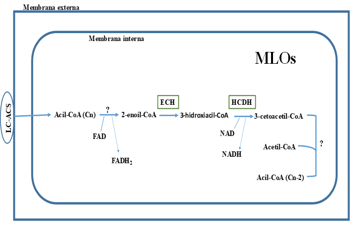 Figura 2. β-oxidación de ácidos grasos en Blastocystis. Fuentes: Denoeud et al., 2011,(45) Vielma y Chacín-Bonilla, 2020(6). ? = Enzima no predicha por los algoritmos utilizados; LC-ACS = Acil-CoA sintetasa de cadena larga; ECH = enoil-CoA reductasa; HCDH = 3-hidroxiacil-CoA deshidrogenasa.