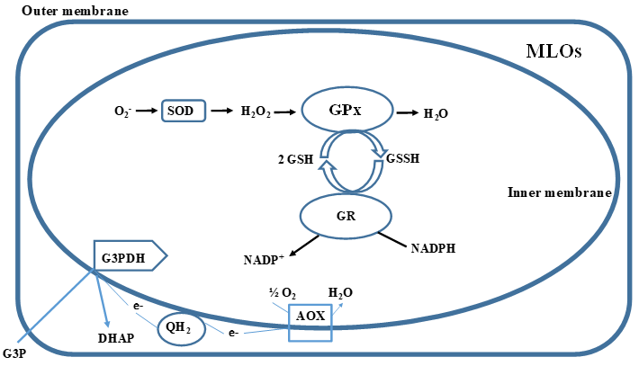 h) Enzimas contra el estrés oxidativo: superóxido dismutasa (SOD), AOX, glutatión reductasa (GR) y glutatión peroxidasa (GPx), el papel del glicerol 3 fosfato deshidrogenasa (G3PDH) no ha sido determinado.(45)