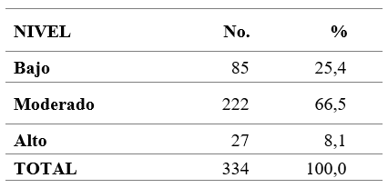 El puntaje del TDM permitió establecer un predominio del nivel moderado (66,5%) entre la muestra estudiada y solo el 8,1% fue alto (tabla 1).