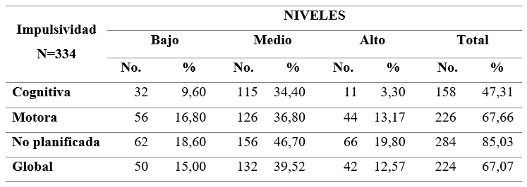 La presencia de impulsividad no planificada (85,03%) predominó entre los participantes; así como, el nivel medio en cada una de subescalas y en la valoración global. La impulsividad cognitiva resultó la de menor incidencia, con un 47,31% (tabla 2).