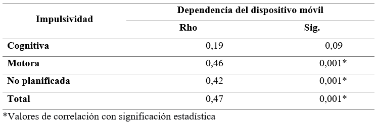 Los resultados de la prueba de correlación evidenciaron la existencia de una asociación estadísticamente significativa (p<0,05), moderada y positiva entre la dependencia al dispositivo móvil y las subescalas de la impulsividad motora y no planificada, además de la global, con valores de Rho que oscilaron entre 0,42 y 0,47 (tabla 3).