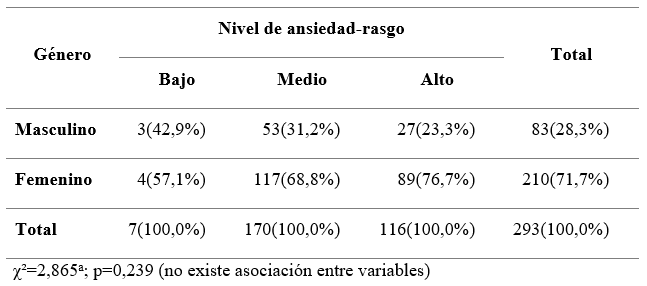 El nivel medio de ansiedad-rasgo resultó el más frecuente en la población estudiada, seguido del alto; sin embargo, la proporción de este último resultó mayor entre las mujeres participantes.