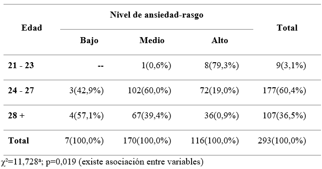La prueba estadística Chi cuadrado permitió establecer la existencia de dependencia entre la edad y el nivel de ansiedad-rasgo. Los más jóvenes manifestaron mayor grado de afectación por esta entidad psicológica.
