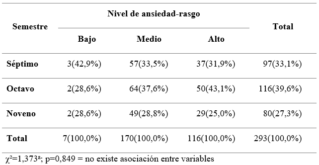 Con respecto a la ansiedad-rasgo y el semestre que cursa, los datos evidenciaron independencia entre estas, predominando el nivel medio en los tres semestres, aunque en los estudiantes de octavo semestre el nivel alto tuvo una incidencia ligeramente superior (43,1%) que en el resto de los grupos (tabla 3).