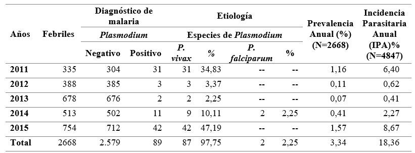 Durante el período 2011-2015, 2668 pacientes fueron sometidos al examen de laboratorio clínico de gota gruesa por sospecha de infección con malaria, siendo 89 casos los que resultaron positivos, significando una prevalencia total de 3,34% y una incidencia acumulada anual de 18,36%, con mayor presencia de la enfermedad en los años 2015 (1,57%) y 2011 (1,16%). En el 97,75% de las muestras positivas se detectó la presencia de P. vivax (tabla 1). En 2014, la indagación sobre el origen de los contagios permitió establecer una posible importación desde el departamento Loreto, provincia Maynas, distrito Torres Causana, Perú.