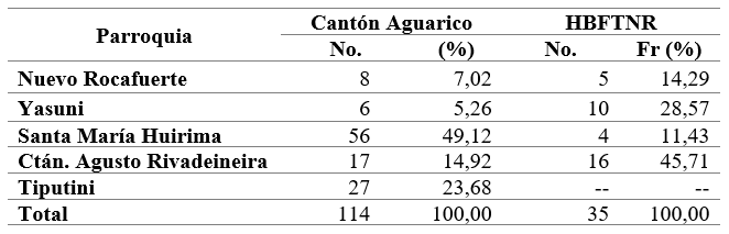 Mediante la pesquisa comunitaria se identificaron mayor cantidad de casos que los detectados en el servicio hospitalario. En relación con la parroquia de residencia, predominaron los pacientes de Santa María Huirima con casi el 50% de enfermos positivos (tabla 2).