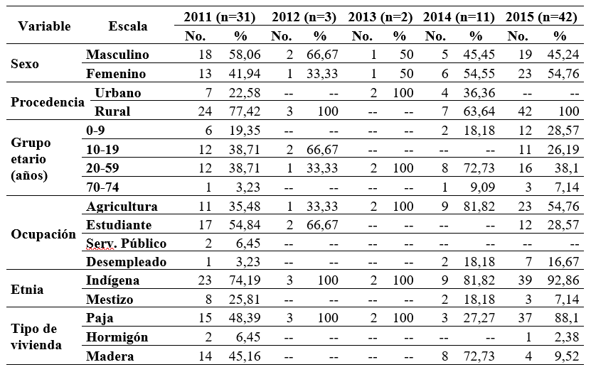Con respecto a los datos sociodemográficos, se pudo apreciar que la mayoría residía en la zona rural (85,39%), los de ocupación en labores agrícolas (51,69%), aquellos de etnias indígenas (85,39%) y los enfermos que vivían en casas construidas de paja (tabla 3).