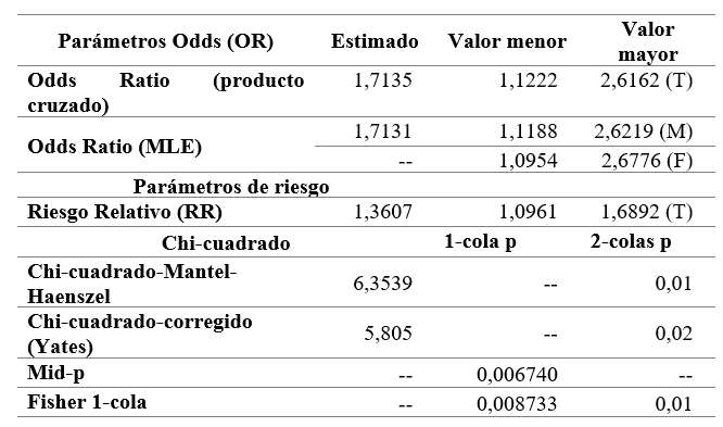 Las pruebas estadísticas empleadas fueron los análisis de frecuencias absolutas y los porcentajes, además se utilizaron las inferenciales Odds Ratio (para establecer la existencia de riesgo) y chi cuadrado (para establecer la significación de los datos en ese contexto del fenómeno).