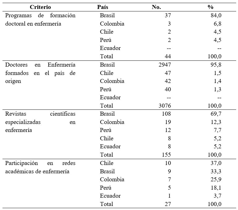 En la región suramericana, el desarrollo de la formación científica y profesional en enfermería no es homogéneo, algunos países han desarrollado más capacidades que otros. Al respecto, el análisis de algunos indicadores de Brasil, Colombia, Chile, Perú y Ecuador (tabla 1) permite evidenciar esa afirmación, entre los que se pueden mencionar: la disponibilidad de programas de formación doctoral, revistas científicas especializadas y redes académicas profesionales.(3,4,5,6,7)
