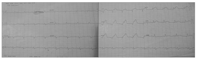 Atendiendo, al diagnóstico electrocardiográfico de síndrome coronario agudo con SCACEST, se decide la administración de fibrinólisis, como opción terapéutica ante las condiciones existentes.(5) Luego, el especialista indicó electrocardiograma de control (figura 3) que mostró ligero signo de elevación ST; además de ecocardiograma flujo Doppler al sexto día de ingres, previo a procedimiento de cateterismo cardíaco, reportando: