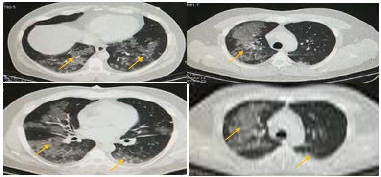 El estudio inicial evidenció insuficiencia respiratoria tipo 1 con acidemia, hipoxemia e hiperlactacidemia (lactato 4.1 mmol) e hipoxemia (PO2 55 mmHg).