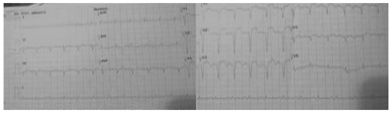 A los 5 minutos al ingreso hospitalario, se realizó un electrocardiograma de doce derivaciones que mostró elevación ST en V1 a V4, infarto anteroseptal (figura 1) con posible afectación de arteria descendente anterior rama septal, eje 90 grados, frecuencia cardíaca 128 latidos por minuto, segmentos electrocardiográficos RR / PR / QRS sin alteraciones.