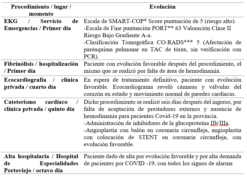 Paciente masculino de 43 años, autosuficiente y que laboraba como oficinista; el que acude al Servicio de Emergencias del Hospital Rodríguez Zambrano de Manta, por presentar un cuadro clínico sostenido por alrededor de tres horas, caracterizado por dolor precordial de tipo opresivo con irradiación a cuello y mandíbula, cuya intensidad era de 8/10 atendiendo a la escala del dolor visual análoga (EVA). Además, manifestó diaforesis, disnea de pequeños esfuerzos, hiposmia y ageusia. En el momento del ingreso y valoración inicial se mantenía consciente.