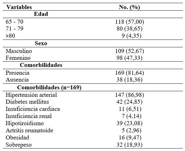 Entre los adultos mayores incluidos en el estudio predominó el género femenino (52,67%) y el grupo etario entre 65 y 70 años; así como, aquellos que presentaron comorbilidades (169 pacientes), entre las que sobresalió la hipertensión arterial, con un 86,98% de incidencia relativo a esa cifra (tabla 1).