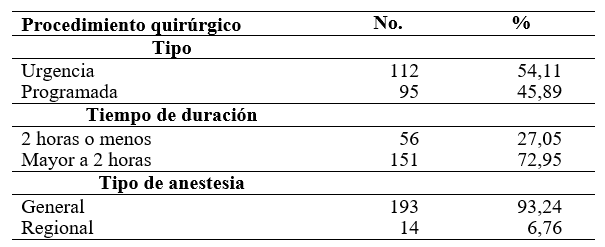 La mayoría de los procedimientos quirúrgicos se realizó de urgencia (54,11%), también las que requirieron más de dos horas de ejecución (72,95%) y las que necesitaron anestesia general (93,24%) (tabla 2).