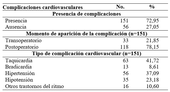 El 72,95% de los participantes tuvo algún tipo de complicación cardiovascular; la mayoría de las cuales, se presentó durante el transoperatorio (78,15% de los 151 pacientes que presentó esa dificultad). Las complicaciones más frecuentes fueron taquicardia (63 operados) e hipertensión arterial (56 participantes) (tabla 3).