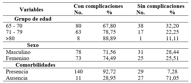 Los resultados descriptivos indican un incremento de presencia de complicaciones en la medida que aumenta la edad, no observándose una diferencia apreciable en cuanto al sexo. La mayoría de los que presentaron comorbilidades (92,72%) tuvieron complicaciones relacionadas con el proceso quirúrgico (tabla 4).