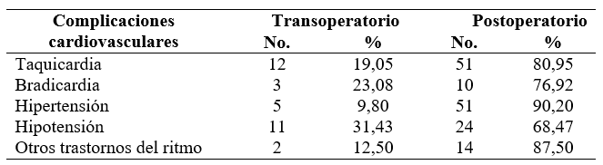 La etapa postoperatoria comprende las primeras 72 horas después de la intervención quirúrgica. Algunas complicaciones cardiovasculares se observaron en los pacientes durante ese período en los pacientes participantes en esta investigación. En relación con este particular, en un estudio con 35 pacientes, los autores informaron mayor incidencia de arritmias y la insuficiencia cardiaca aguda.(33)