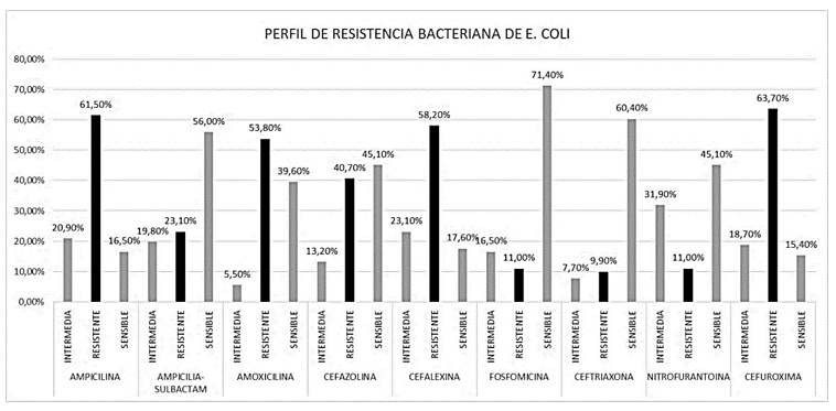 El análisis del antibiograma mostró que la resistencia bacteriana de E. coli fue la siguiente: ampicilina 61,5%, cefuroxima 63,7%, cefazolina 40,7%, cefalexina 58,2% y ampicilina-sulbactam 23,1% (figura 1); mientras que, la sensibilidad a: fosfomicina 71,4%, ceftriaxona 60,4% y nitrofurantoina 45,1%.