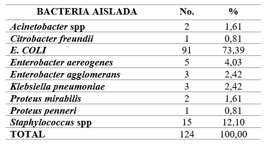 En el presente estudio, E. coli resultó la bacteria más frecuente, lo que concuerda con lo reportado por la Sociedad Americana de Enfermedades Infecciosas para algunos países de la región: Colombia 64% y Brasil 66,2%.(10)