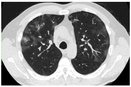 · Tomografía axial computarizada de tórax que reflejó infiltrado algodonoso bilateral con distribución parchada, además de infiltrados periféricos y subpleurales (figura 1).