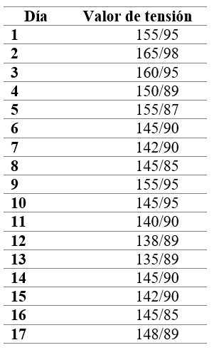 El tratamiento indicado durante el alta se cumple durante 5 meses, realizando autocontroles que reflejan niveles normales y se suspende administración de medicamento. Durante las dos semanas posteriores estuvo asintomático y con cifras tensionales dentro de los límites normales, pero luego presenta cefalea holocraneana, por lo que, acude a valoración médica que reporta tensión arterial de 147/104 que requiere de retomar el tratamiento con enalapril de 10 mg cada día en la mañana.