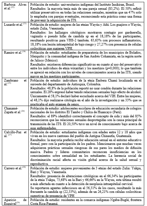 El estado de las ITS en los grupos étnicos autóctonos latinoamericanos resulta un tema de interés para la comunidad científica, se aprecia una diversidad de abordaje del fenómeno en los países de la región, sobresaliendo el número de estudios relacionados en el contexto mexicano.