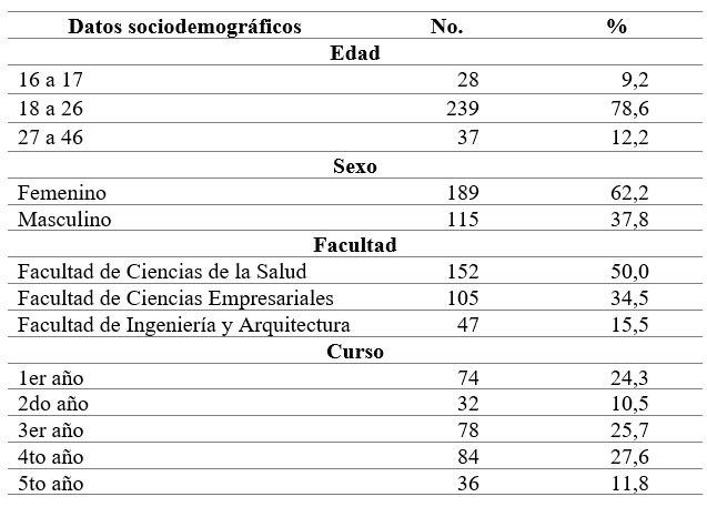 La descripción sociodemográfica de los participantes posibilitó establecer que el 78,6% de la muestra de estudio tenía edades entre 18 y 26 años y el 62,2% correspondió a representantes del sexo femenino (tabla 1).