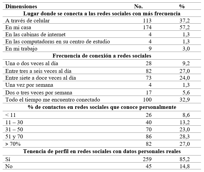 174 estudiantes, para un 57,2%, declararon que se conectan a redes sociales desde su casa con mayor frecuencia y el 32,9% dijo que durante todo el día. La mayoría utiliza sus datos personales reales en sus perfiles en redes sociales (85,2%) y también preponderan los que conocen personalmente a entre 51 y 70% de sus contactos sus redes (28,3%) (tabla 2).
