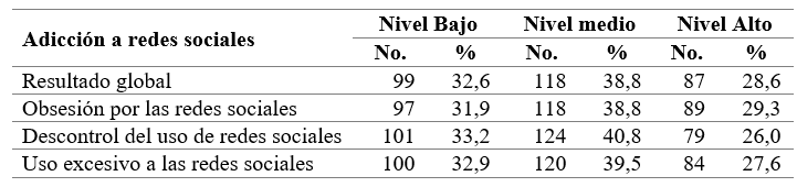 Entre los estudiantes incluidos en el estudio predominaron los que tenían un nivel medio en todas las dimensiones analizadas: obsesión por las redes sociales (38,8%), descontrol en el uso de las redes sociales (40,8%) y uso excesivo de las redes sociales (39,5%); en consecuencia, la mayoría tuvo un nivel medio de adicción a las redes sociales (38,8%) (tabla 3).