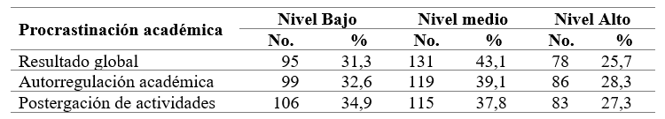 Con respecto al estado de la variable procrastinación académica y sus dimensiones, también se observó un predominio del nivel medio, estando en esta categoría un 43,1% en su valoración global, 39,1% en la autorregulación académica y 37,8% en la postergación de actividades (tabla 4).