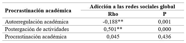 Los resultados obtenidos evidenciaron que no existió relación entre la adicción a las redes sociales y la procrastinación académica (p= 0,436, según prueba de Spearman); aunque, sí se estableció con respecto a las dimensiones: autorregulación académica (Rho=-0,188; p=0,001) y postergación de actividades (Rho= 0,501; p=0,000).