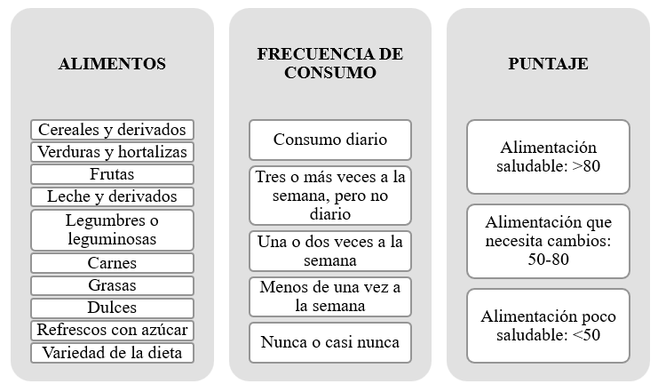 · En padres o tutores legales: calidad de la dieta,(13) cuyos datos se recolectaron mediante el Cuestionario de Frecuencia de Consumo Alimentario, utilizando el Índice de Alimentación Saludable para la población española (IASE)(14) como escala de trabajo (este instrumento valora la frecuencia del consumo de nueve grupos alimentarios en cinco categorías y un indicador de variedad de la dieta, obteniéndose un puntaje final (figura 1).