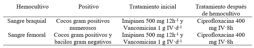Atendiendo al diagnóstico presuntivo de neumonía y choque séptico de posible origen pulmonar con fallo de órganos, además de los posibles riesgos por gérmenes gram negativo y gram positivo, se indicó tratamiento con carbapenémicos y glicopeptidos (imipenem de 500 mg IV c/12 horas y vancomicina 1 g IV c/24 horas).