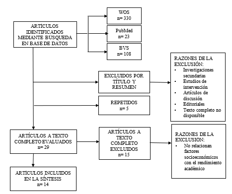 La estrategia de búsqueda se realizó empleando términos establecidos a partir de los descriptores MeSH/DeCS: factores socioeconómicos, rendimiento académico y estudiantes de enfermería. El procedimiento incluyó el uso de sinónimos en español y las respectivas palabras clave en idioma inglés, además del operador booleano AND (tabla 1).