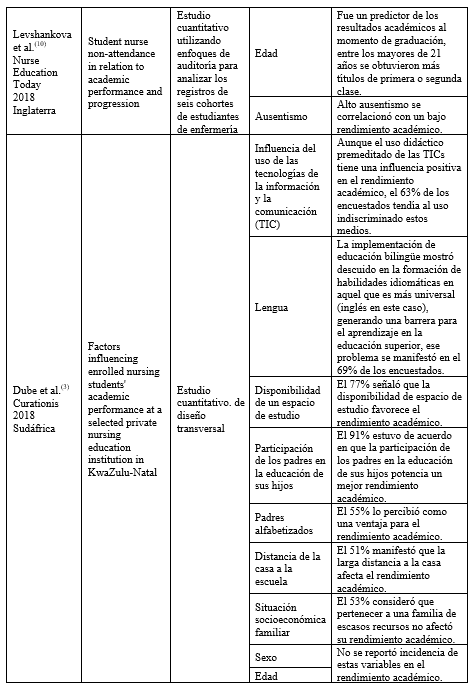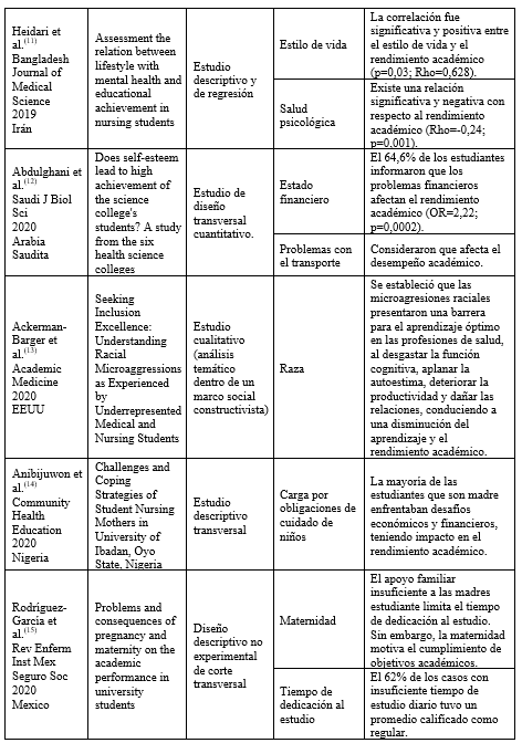 Resumen: La formación exitosa de profesionales de la enfermería es una necesidad para la sociedad contemporánea. Así, la investigación tuvo el objetivo de establecer las regularidades reportadas por diferentes autores acerca de la forma en que los factores socioeconómicos interactúan con el rendimiento académico en diversos contextos formativos de profesionales de la enfermería. Las autoras realizaron una revisión integrativa. La búsqueda se hizo en las bases de datos: WOS, PubMed y BVS, resultando 461 fuentes iniciales, quedando 14 seleccionas al final, de las que, la mayoría tenía enfoque cuantitativo, corte transversal, de tipo descriptivo o correlacional, publicadas entre 2016 y 2021, en su mayor parte generadas en países africanos y latinoamericanos. El rendimiento académico en estudiantes de enfermería se está influenciado por factores socioeconómicos, tales como: etnia, tener empleo, problemas económicos, insuficiente apoyo familiar, demasiado uso de las tecnologías de la información y las comunicaciones, dificultades psicológicas y estilo de vida poco saludable.