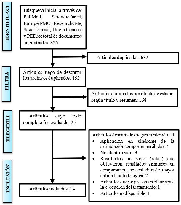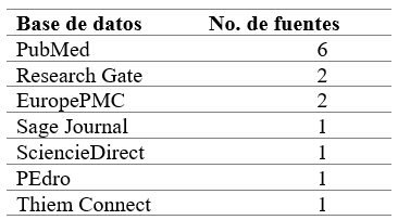 La investigación se realizó a través de una revisión sistemática de artículos indexados en las bases de datos: PubMed, SciencieDirect, EuropePMC, ResearchGate, Sage Journal, Thiem Connect y PHysiotherapy evidence database (PEdro). Los procedimientos correspondientes se hicieron siguiendo los pasos establecidos en la metodología PRISMA:(8)