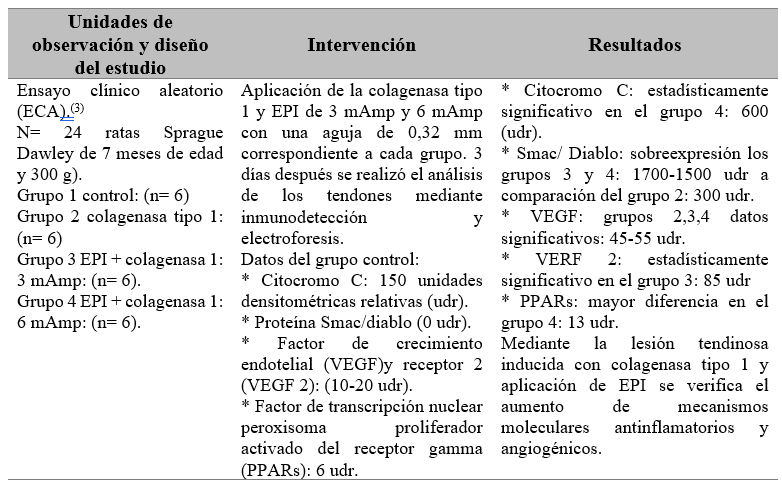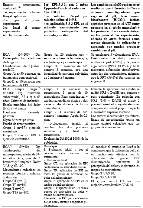 Los 12 estudios en humanos correspondieron a comparaciones de la aplicación de EPI con respecto a modalidades convencionales de fisioterapia (termoterapia, medidas electro terapéuticas), programa de ejercicios, infiltración de corticoides y punción seca.(1,7,9,10,11,12,13,14,15,16,17,18) EPI tuvo mayor impacto en lesiones musculoesqueléticas de tipo tendinopatías en diferentes regiones anatómicas: cervical,(1) supraespinoso,(7,10,11) infraespinoso,(9) aductor largo,(12) patelar,(13,14,15,16) fasciosis plantar(18) y dolor de talón(17) (tabla 3).