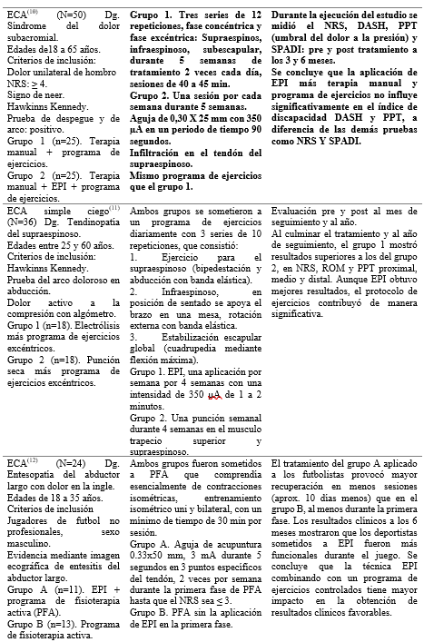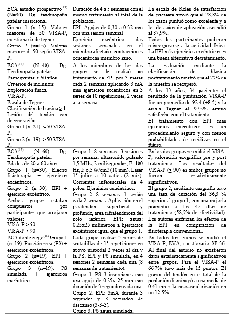 En esos estudios, 355 sujetos fueron tratados mediante EPI. La mayoría de estos (54,2%) recibió ese tratamiento combinado con un programa de ejercicios excéntricos y en el 31,5% se aplicó esta como única terapéutica. 284 personas integraron los grupos control: el 49,6% desarrolló un programa de ejercicio excéntrico, el 39,1% punción seca (PS), ultrasonido, termoterapia, electroterapia no invasiva y el 11,3% infiltración con corticoides.