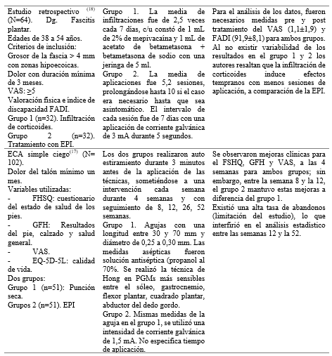 Los resultados del estudio retrospectivo mostraron una comparación entre infiltración de corticoides y EPI, determinando que ambas modalidades son útiles para la fasciosis plantar; aunque, la infiltración con corticoides redujo el dolor en menor cantidad de sesiones, con la recomendación de no extender su uso a mediano y largo plazo por la degeneración del tejido que puede causar.(18)