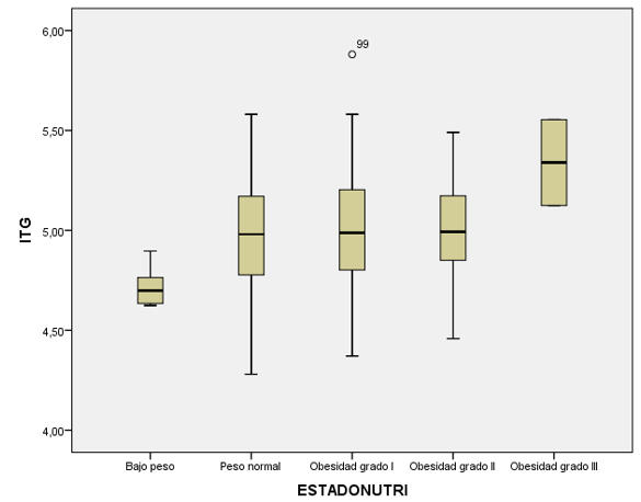 La comparación de las medias de los índices de triglicéridos glucosa en los grupos establecidos a partir del estado nutricional, posibilitó apreciar la presencia de una diferencia con respecto al grupo de obesos de grado III, en los que se observó la cifra de 5,3 (gráfico 1).