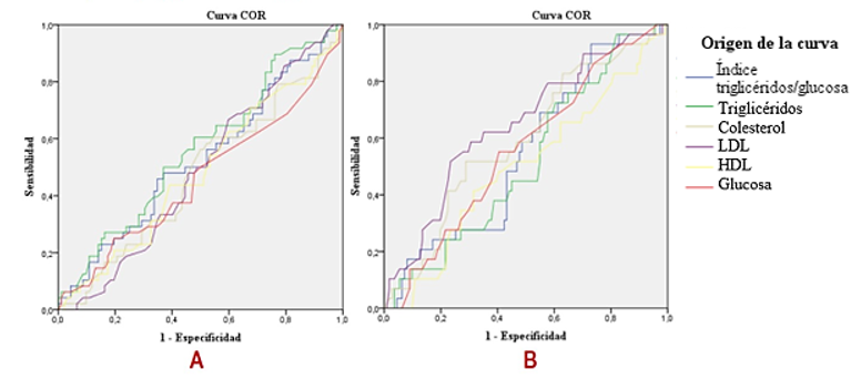 Las curvas de COR reflejaron la presencia de potencia predictiva del 53-55% inherente al índice triglicéridos glucosa con respecto al desarrollo de sobrepeso u obesidad (gráfico 2), pudiendo establecer un punto de corte en 4,8 para la ocurrencia de sobrepeso u obesidad, con una sensibilidad y especificidad de entre 81-86% y 26-28% respectivamente.