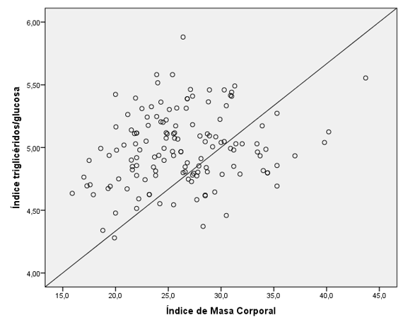 El índice de triglicéridos glucosa se correlacionó significativamente con el índice de masa corporal de manera directa y con intensidad leve (r=0,208; p<0,05); lo que se puede apreciar en la dispersión de los valores al graficarlos (gráfico 3).