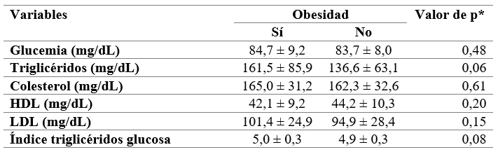 Al comparar las variables analíticas de laboratorio entre los pacientes adolescentes según presencia de obesidad, no se observaron diferencias estadísticamente significativas en ninguna de estas; aunque las medias con mayores discrepancias fueron las referentes a los triglicéridos, con p=0,06.