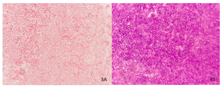 El reporte histopatológico indicó conductos respiratorios con inflamación crónica y focos de hemorragia intralveolar, presencia de material fibrinoide con abundantes estructuras tubulares pauciseptadas irregularmente ramificadas en ángulos mayores de 45 grados con centro claro y otras redondeadas. Las paredes eran PAS positivas, siendo un resultado compatible con mucormicosis pulmonar (figura 3).