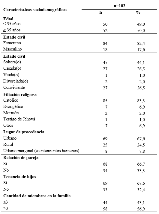 En los participantes, el 51% tenía una edad mayor de 34 años; el 44,1% tenía estatus de soltero(a); el 82,4% correspondió al sexo femenino; el 83,3% declaró filiación religiosa católica; el 67% vivía en zona urbana; el 66,7% estaban en una relación de pareja; el 66,7% no tenían hijos y el 56,9% vivía en un núcleo familiar con más de dos miembros (tabla 1).